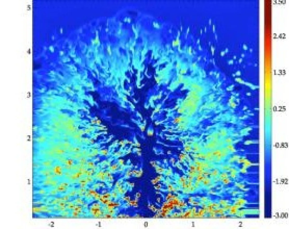 Figure Caption: Mid-plane density slice of a 1045 erg s-1 jet (blue colour) powering its way through a clumpy medium populated with dense clouds (yellow and red). The colour bar indicates the value of log (number density). The clouds are responsible for the free-free absorption of the radio emission from the non-thermal jet plasma and this determines the resulting spectrum.